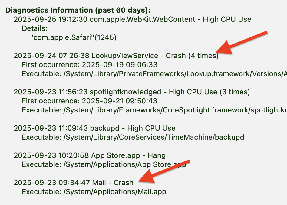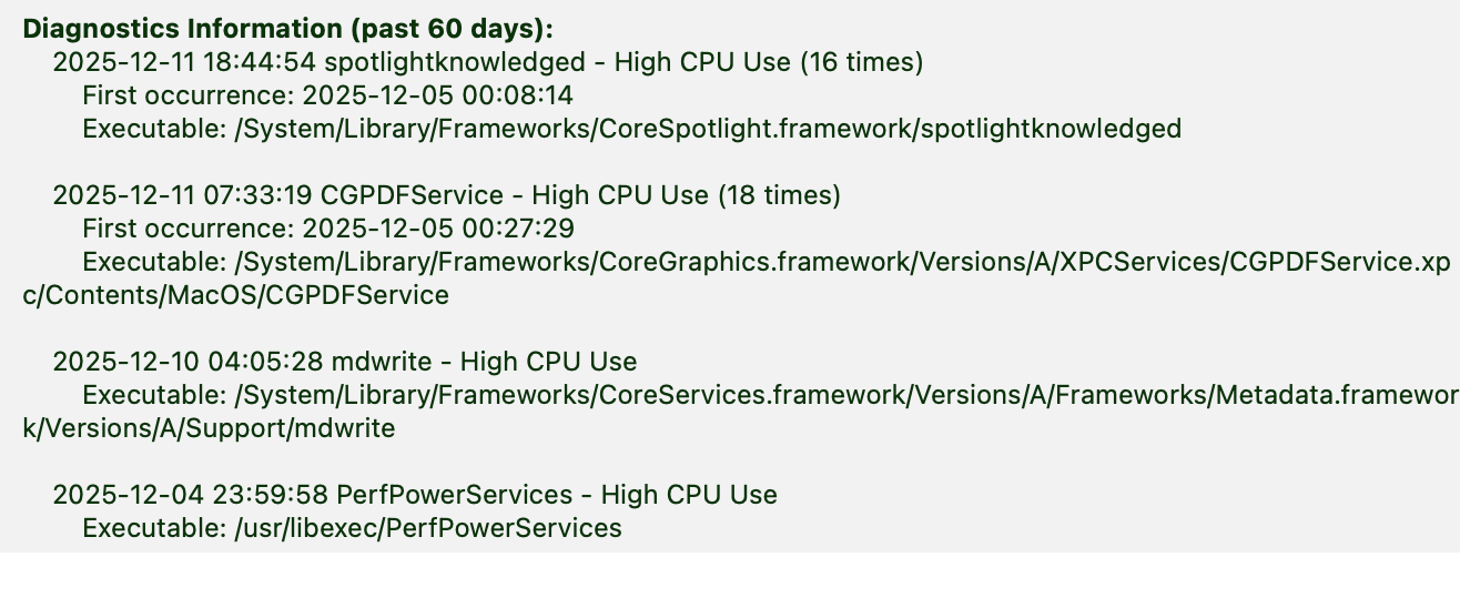 EtreCheck Pro reports no relevant issues: I'd already checked this when I first spotted the problem and before posting here. This is a 2024 MBPro M4max so not short of cpu/RAM/space.