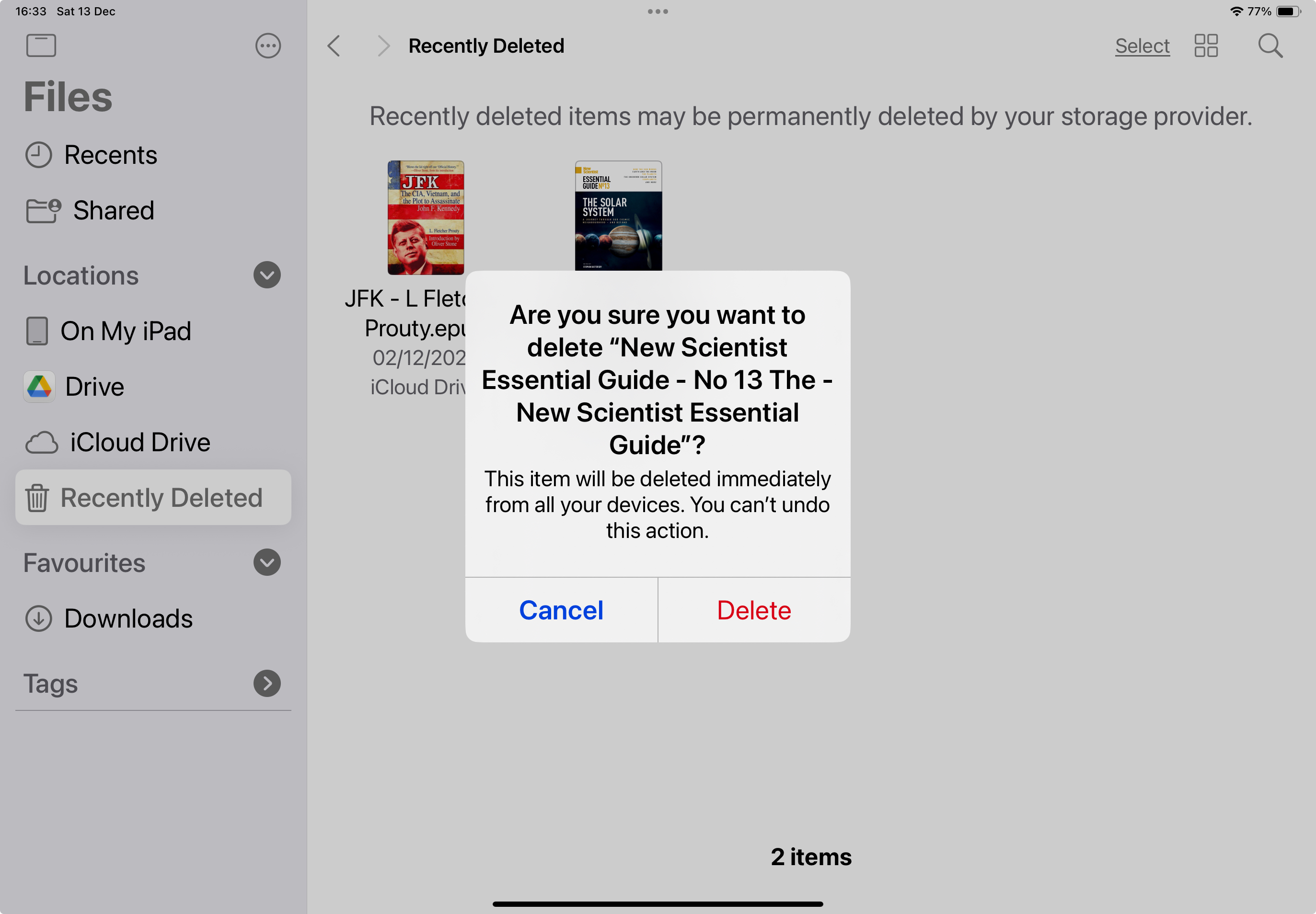 For a couple of years I am working on my "heritage" and have gathered lots of information about dead people and living people as well. At home I used a MacPro for that, because most of the data are on line, but, because the -so called - genealogy libraries are not in my direct neighbourhood I use my iPad occasionally when I visit one of those libraries. This is an iPad Air M2. A few days ago I wanted to delete the files which in the mean time had been gathered by the iPad in the Recents folder, because these files can contain very private information. And I don't want them to be accessible to anyone. Deleted files are still accessible in the "Recently deleted" folder and you could delete them from there as well. But doing so deletes this file from any other location, that is disc, folder, iCloud etc. So the original file is lost. Why is meant this way? And is there a way to bypass Recents so these "critical files" are not mentioned in this folder.