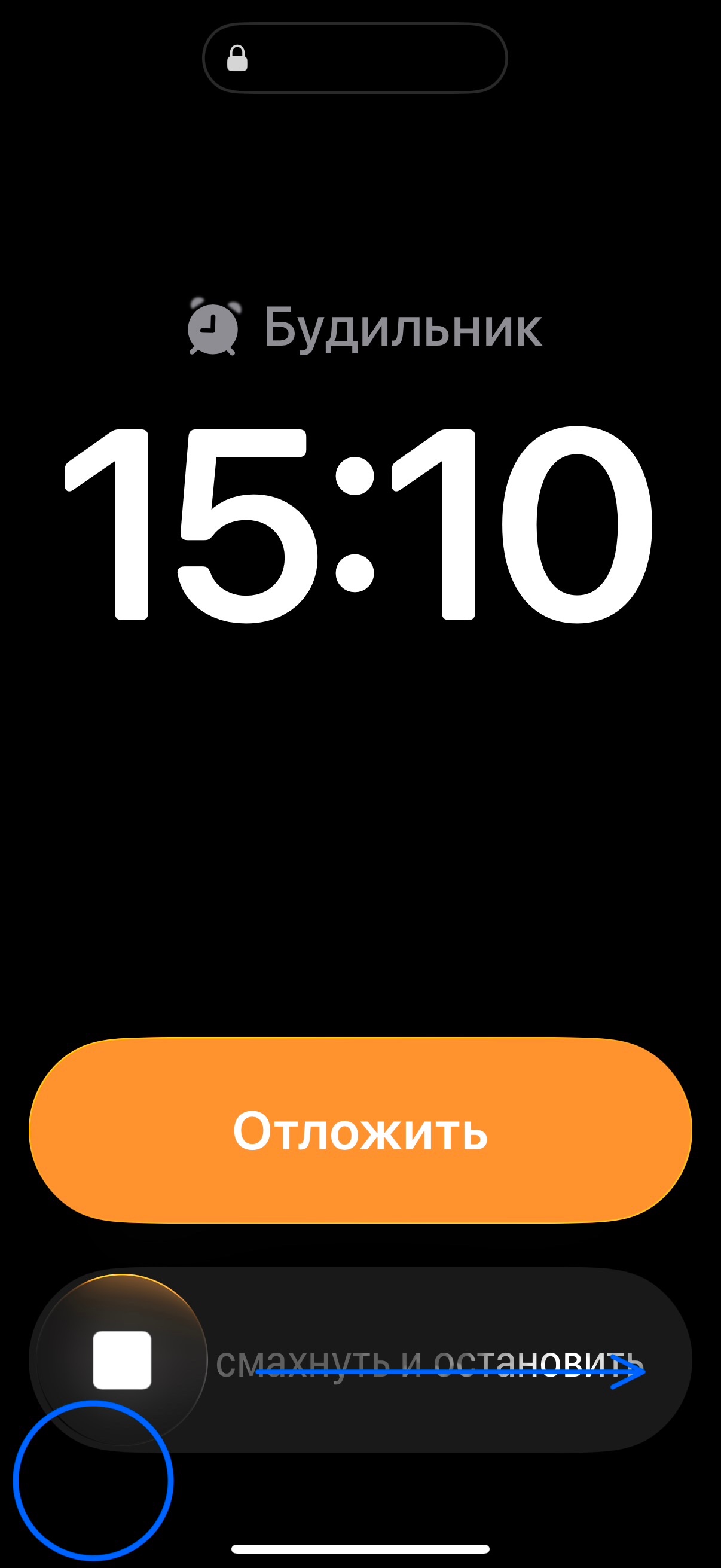 Но он отключается когда я несколько раз нечайно нажимаю на экран в области круга. Без свайпа вправо. Не провожу пальцем. Несколько раз нажимаю пока пытаюсь найти телефон на тумбе.
