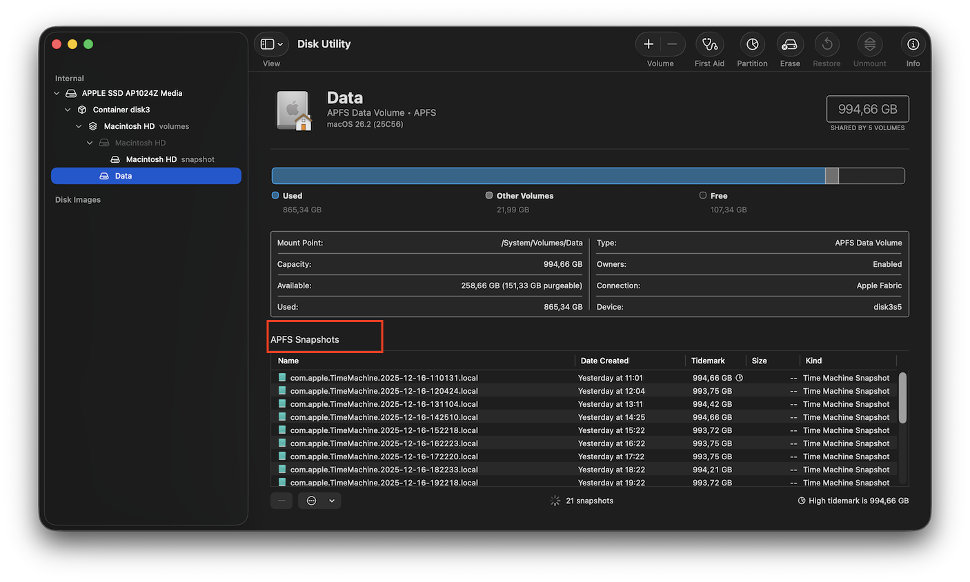 It appears that removing Time Machine snapshots via Disk Utility freed only about 25 GB of space. I still have approximately 175 GB classified as System Data, so I’m unsure how to proceed, even after reviewing the other forum posts that were mentioned.