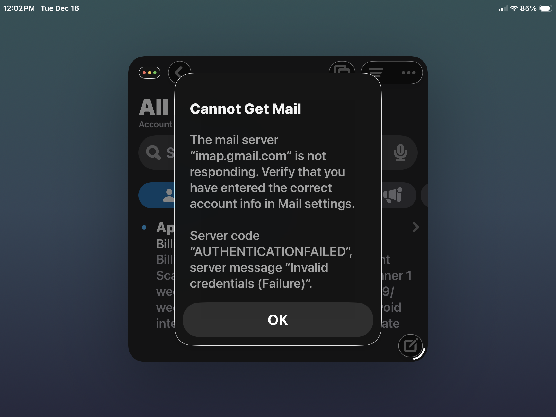 It’s usually caused by incorrect login details or issues with the IMAP settings. First thing I’d check is whether you’ve got the correct email and password in your Mail settings. Also, make sure IMAP is enabled in your Gmail settings (you can find that in the Gmail settings under "Forwarding and POP/IMAP").