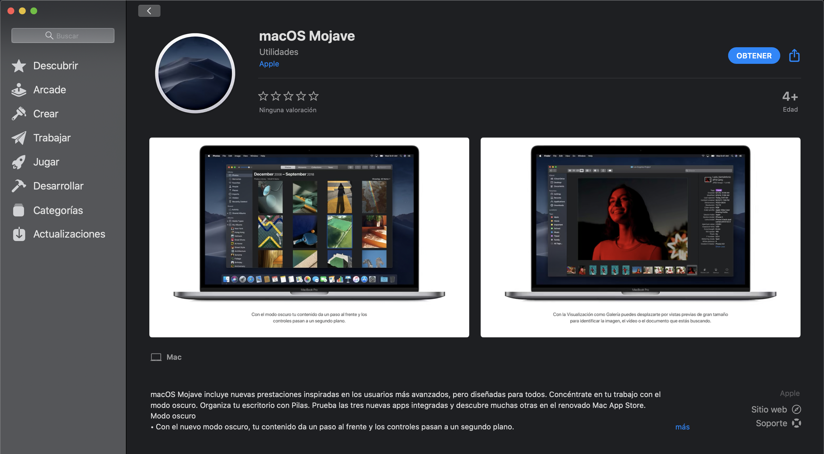 He escrito macOs Mojave en App Store y no aparece ningún sistema operativo. Igualmente el link que aparece en soporte técnico de apple para este software, cuando pincho en él, me indica que este producto ya no está disponible. Alguien que me proporcione ayuda al respecto?