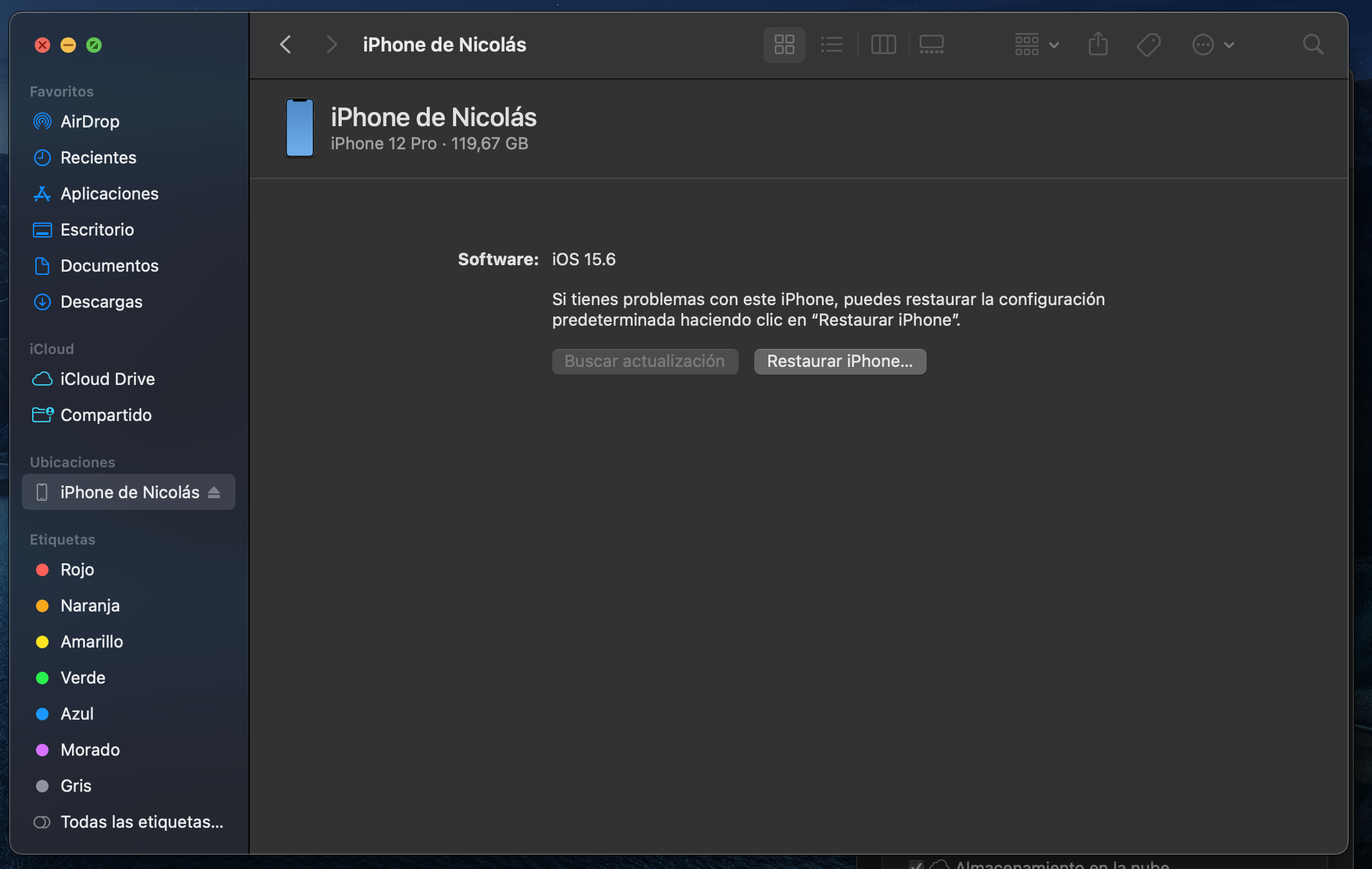Como explica el titulo, no me es posible ver mi iPhone en Finder, ya que al conectarlo vía usb, indica que no se puede leer el contenido del iPhone. Anteriormente me comuniqué con el soporte de Apple quienes me indicaron Restaurar el iPhone mediante el botón que arroja Finder, pero al hacer clic no se produce ninguna respuesta. Adicionalmente restauré la configuración de confianza en el iPhone pero aún así, tampoco se puede acceder a su contenido.