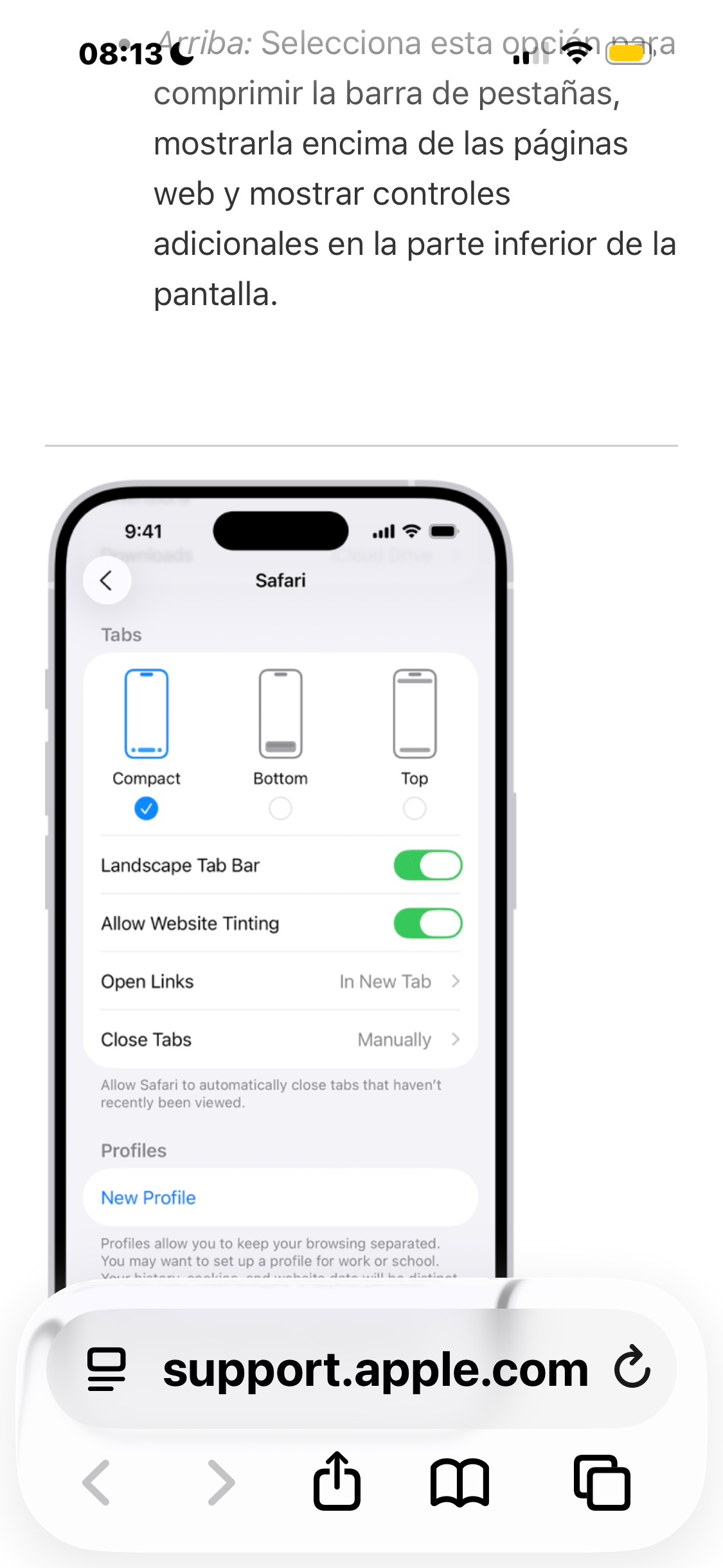 No puedo activar la vista compacta en Safari. Solamente me permite elegir entre arriba o abajo