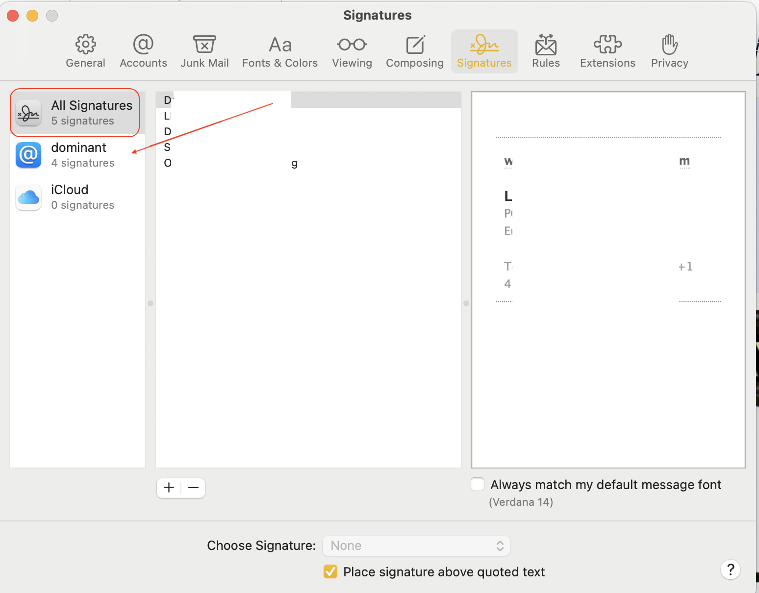 Then create and add signature back in, from All Signature drag your preferred to the Account you want to use the sig.