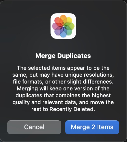 Also, the photos may have slight differences, and photos will have to decide, which is the best version. That is not always the version I would have liked to keep. when I let Photos merge two photos, I am adding them to an album before I merge them. This way it is easier to check, which photos I need to recover to get the version back, that I like most. Here is screenshot taken on my Mac before merging two photos with slight differences: